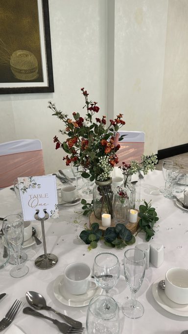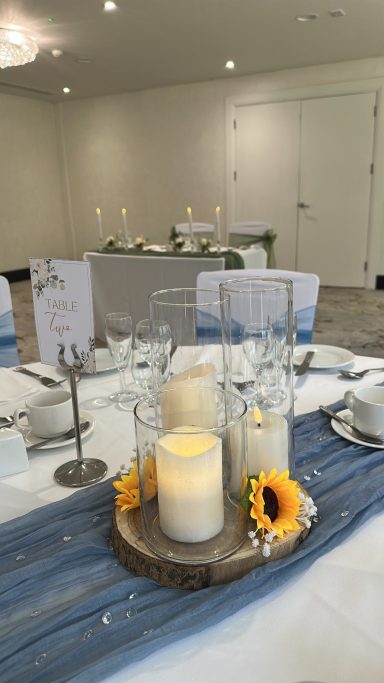 A few pictures of our big and small centre pieces, this is not our limit, we can offer bespoke centrepieces with different flowers, more glass vases to your taste, simpler candles and lots more that we can discuss if you are considering us!